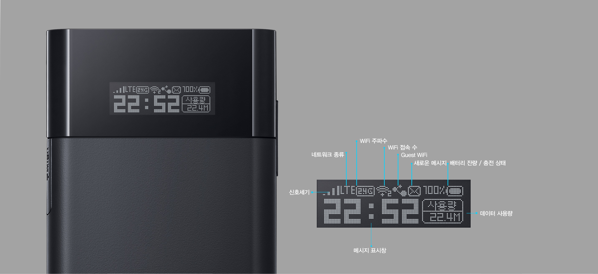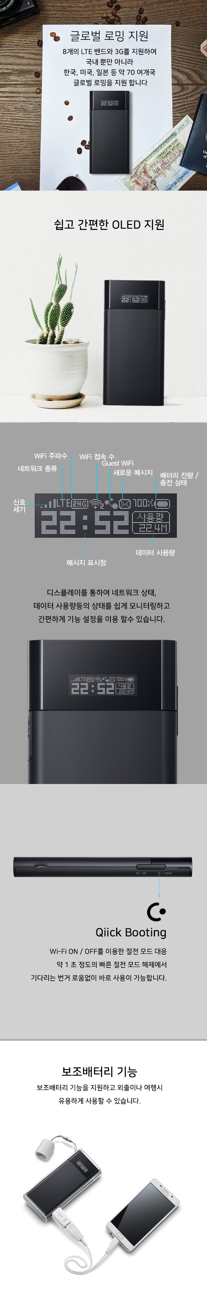디스플레이를 통하여 네트워크 상태, 데이터 사용량등의 상태를 쉽게 모니터링하고 간편하게 기능 설정을 이용 할수 있습니다.